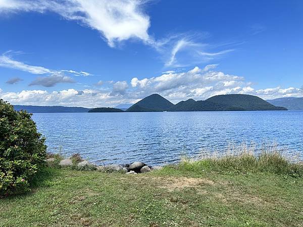 湖中隆起的是因火山爆發後的四個山丘, 就這麼完美的呈現在近乎圓形的洞爺湖的湖中央,