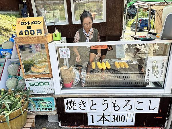 用完餐在旁邊的藝品店逛街時, 看到好幾個人手上都拿著水果玉米在啃, 原來是往熊牧場的方向有攤販,
