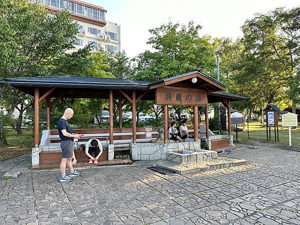 雕刻公園周遭也有很多免費足湯手湯, 可以坐著泡腳靜靜地欣賞洞爺湖美景,