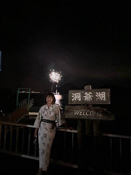 在洞爺湖雕刻公園的乘船碼頭, 每晚都會沿著飯店林立的這一側湖面, 由一艘煙火船沿著湖邊施放煙火,
