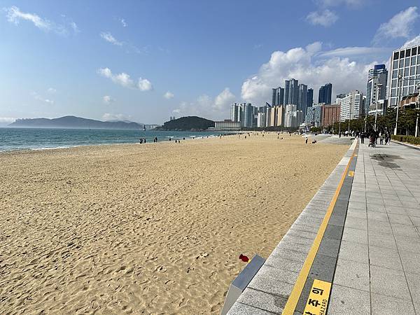 沿著海雲台海水浴場沿岸的人行步道散步約十多分鐘, 邊欣賞沙灘海洋美景即可抵達尾浦站,