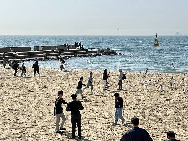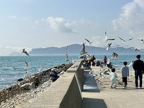 蠻多人聚集在這餵食海鷗, 畫面很是美麗~~到了海堤的路口往上走就是海雲台藍線公園入口處,