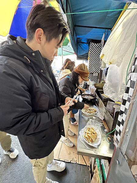 又看到這家煎台上的食物非常美味, 吃起來有點像是香煎河粉, 旁邊的韓國人還教我們淋些醬油辣椒更美味,