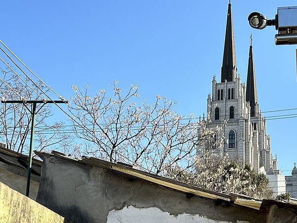 從西門市場附近的羅曼史PAPA 咖啡廳的近代胡同巷弄內, 往遠處看就會看到高聳的教堂尖塔,