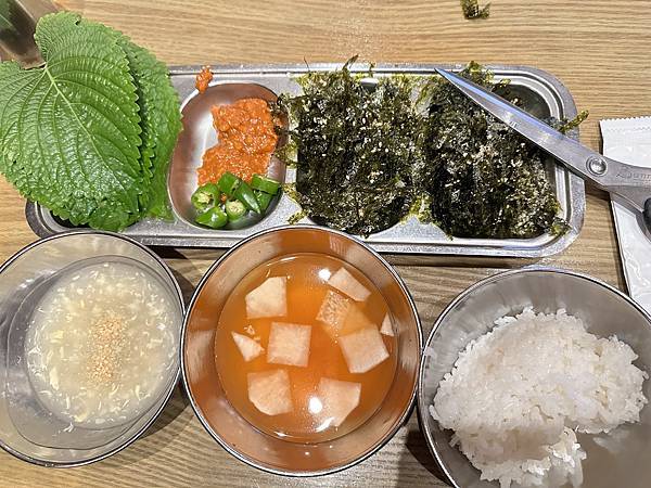 因為這餐實在是非常超值, 店家不僅提供飲料免費喝,生菜, 紫蘇葉, 辣椒, 泡菜醬菜及白飯任你吃啊!!