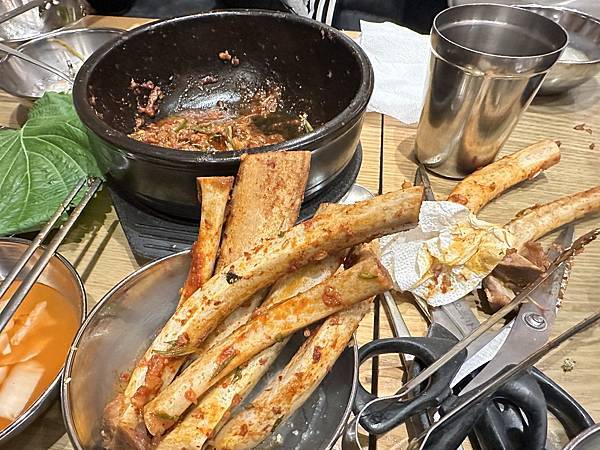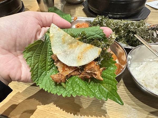 店家會教你如何將排骨肉從整隻排骨剪下來, 再剪成一小塊醮著醬汁在搭配上芝麻葉醬菜海苔,