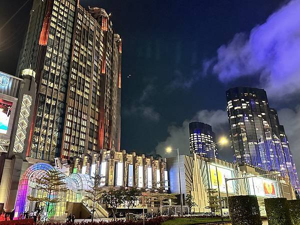 新濠影匯W酒店的大門口正對面就是巴黎人酒店, 對街就是倫敦人酒店, 夜晚華燈初上真的是絢麗極了!!
