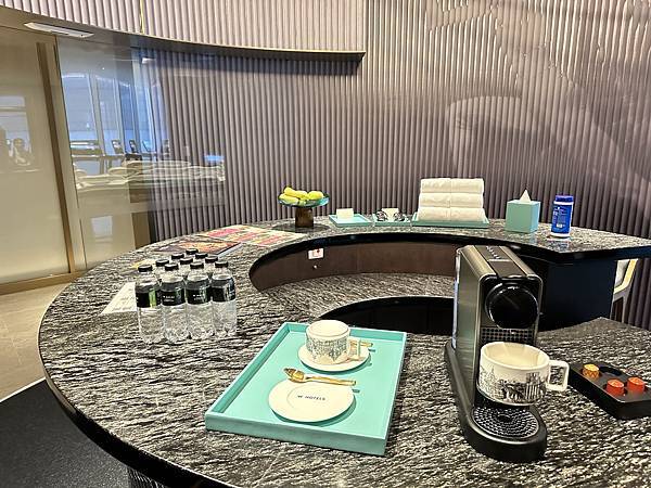 健身房的吧檯有免費的水果, 礦泉水及膠囊咖啡都可以自行使用,