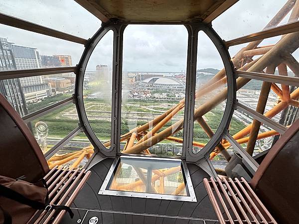 這座8字摩天輪總共有17個包廂, 依序輪轉至23層樓高再往下, 能將澳門城市景致盡收眼底,