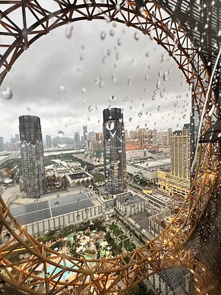 可能是天氣悶熱, 包廂內又有冷氣造成摩天輪窗戶有些水氣, 往另一個角度看過去就是此行我們入住的W酒店,