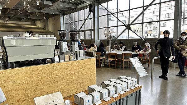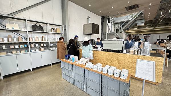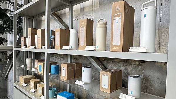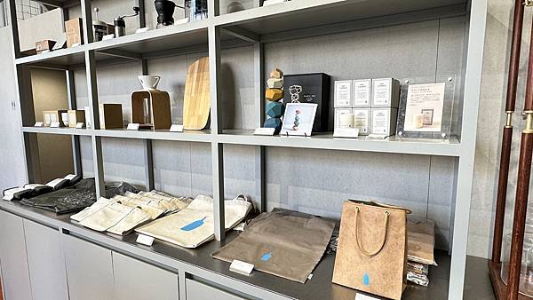 整棟咖啡館採挑高設計, 門口點餐櫃檯有販售藍瓶咖啡各式馬克杯, 保溫杯, 環保袋及咖啡豆等等商品,